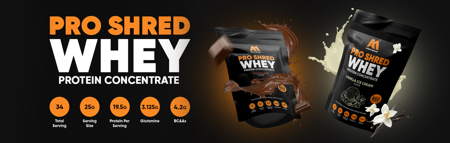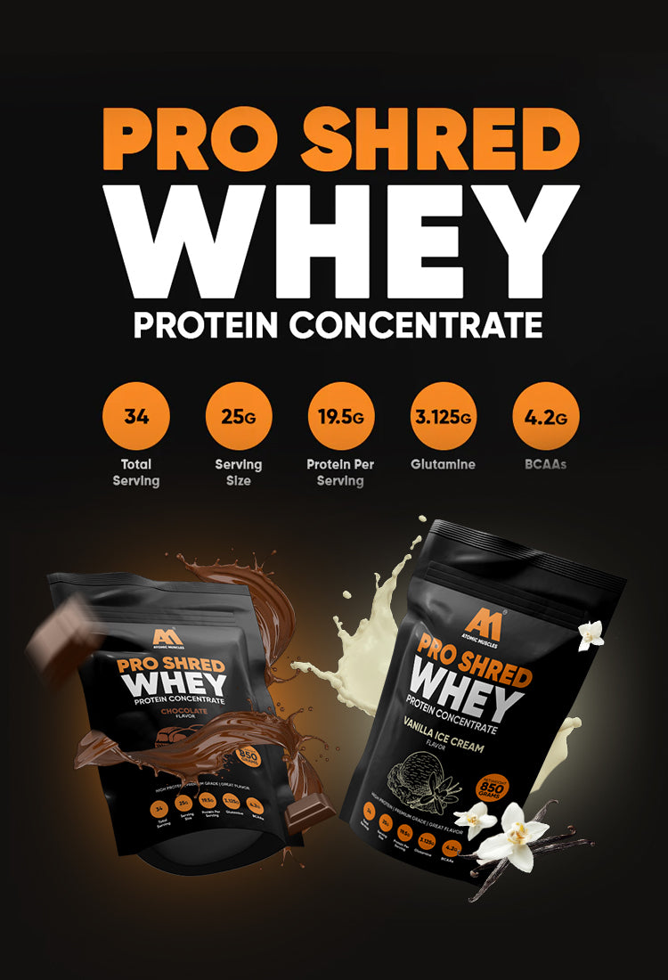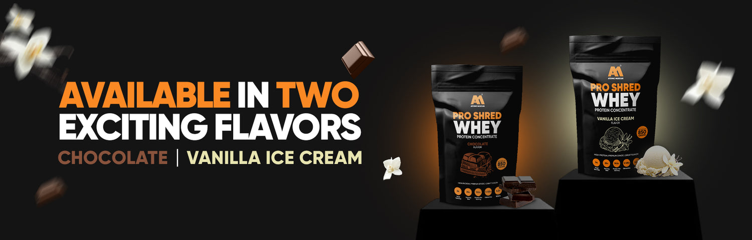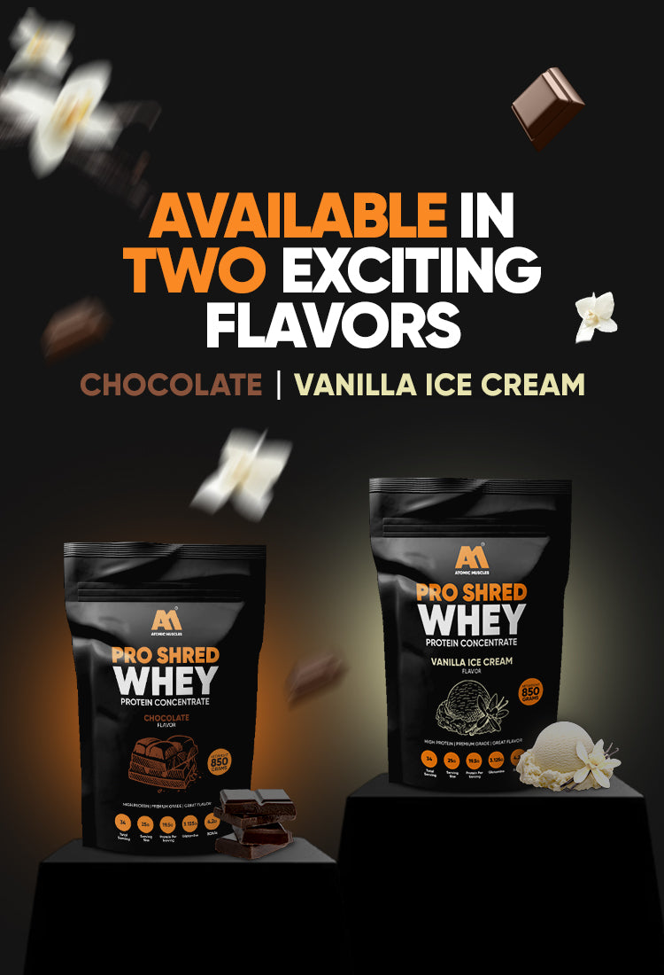 Pro Shred Whey Protein is available in Chocolate and Vanilla Ice Cream Flavour